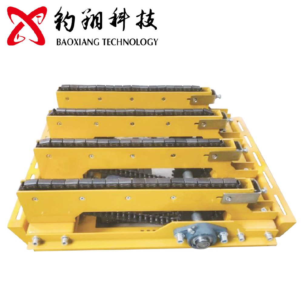 2.利用电动或者气动机构,将水平输送机构顶起,水平输送机构将货物移栽至90°方向输送设备,实现转向功能,此方式货物方向会改变。旋转移栽利用水平输送机构整体旋转90°,再将货物输送出,此方式货物方向不会改变。